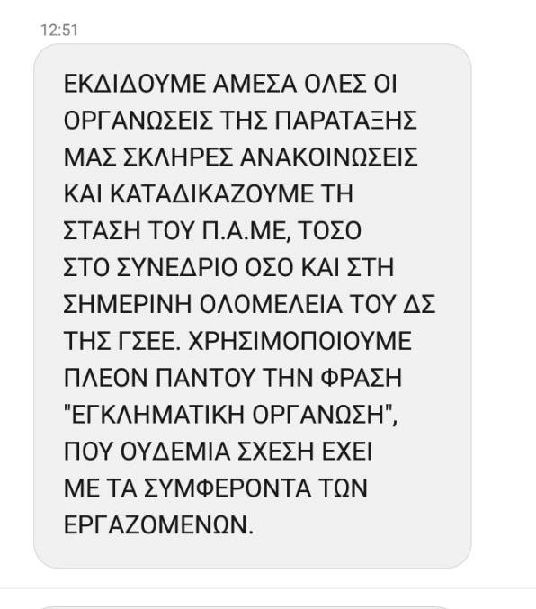 Ταυτόχρονα η συνδικαλιστική μαφία της ηγετικής ομάδας της ΓΣΕΕ Παναγόπουλου-Καραγεωργόπουλου-Κιουτσούκη-Βασιλόπουλου, στέλνει στις ομοσπονδίες και στα Εργατικά Κέντρα το παρακάτω μήνυμα: