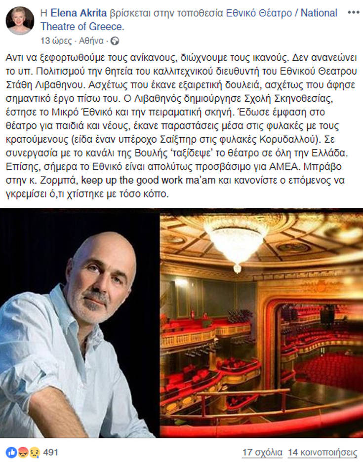 «Αντί να ξεφορτωθούμε τους ανίκανους, διώχνουμε τους ικανούς. Δεν ανανεώνει το… υπουργείο Πολιτισμού την θητεία του καλλιτεχνικού διευθυντή του Εθνικού Θεάτρου Στάθη Λιβαθηνού. Ασχέτως που έκανε εξαιρετική δουλειά, ασχέτως που άφησε σημαντικό έργο πίσω του. Ο Λιβαθηνός δημιούργησε Σχολή Σκηνοθεσίας, έστησε το Μικρό Εθνικό και την πειραματική σκηνή. Έδωσε έμφαση στο θέατρο για παιδιά και νέους, έκανε παραστάσεις μέσα στις φυλακές με τους κρατούμενους (είδα έναν υπέροχο Σαίξπηρ στις φυλακές Κορυδαλλού). Σε συνεργασία με το κανάλι της Βουλής “ταξίδεψε” το θέατρο σε όλη την Ελλάδα. Επίσης, σήμερα το Εθνικό είναι απολύτως προσβάσιμο για ΑΜΕΑ. Μπράβο στην κυρία Ζορμπά, keep up the good work ma’am και κανονίστε ο επόμενος να γκρεμίσει ό,τι χτίστηκε με τόσο κόπο».