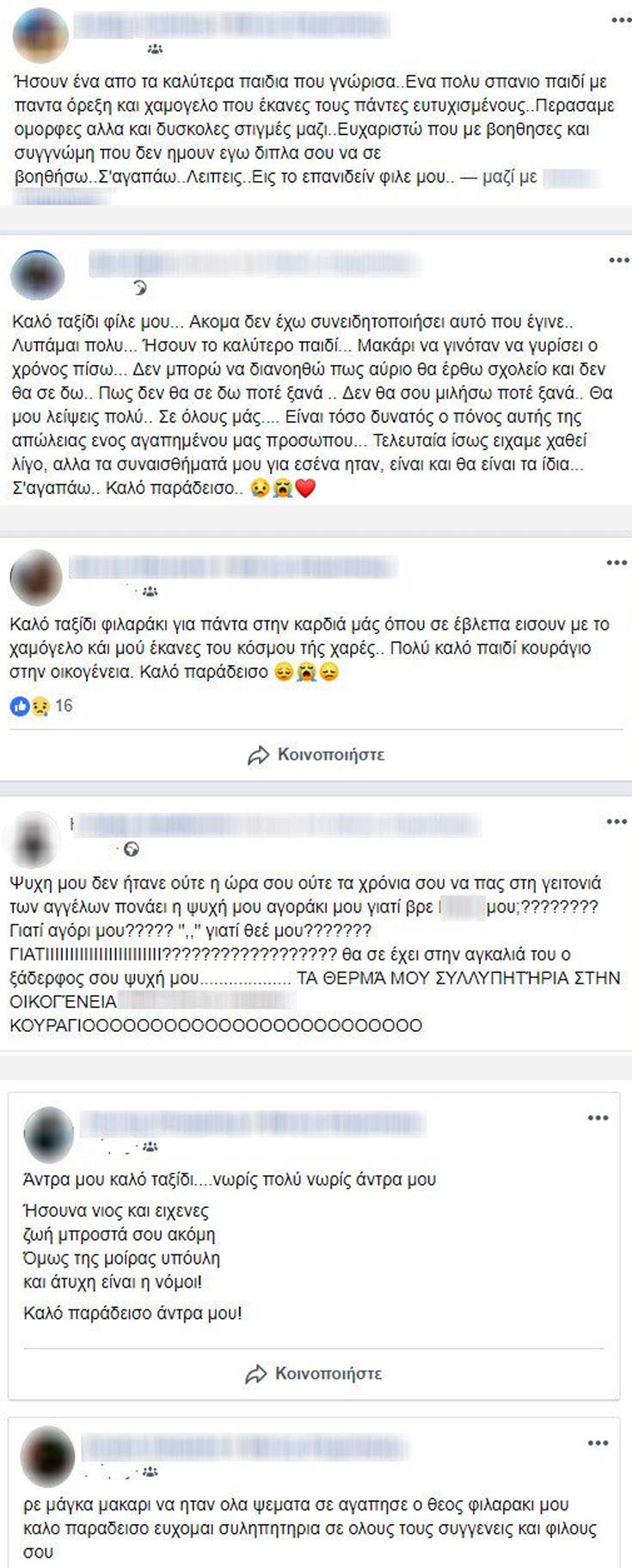 «Ήσουν ένα από τα καλύτερα παιδιά που γνώρισα… Ένα πολύ σπάνιο παιδί με πάντα όρεξη και χαμόγελο που έκανες τους πάντες ευτυχισμένους… Περάσαμε όμορφες αλλά και δύσκολες στιγμές μαζί.. Ευχαριστώ που με βοήθησες και συγγνώμη που δεν ήμουν εγώ δίπλα σου να σε βοηθήσω… Σ’ αγαπάω… Λείπεις… Εις το επανιδείν φίλε μου».