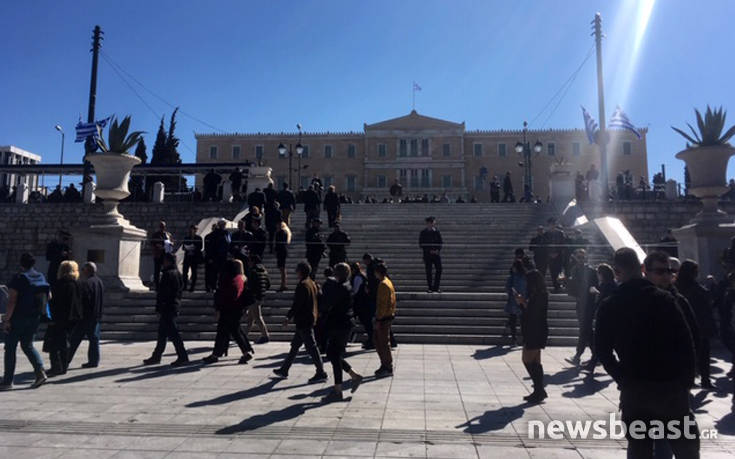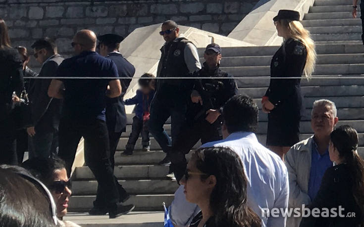 Εντύπωση αλλά και διαμαρτυρίες προκάλεσε η παρουσία ενός αστυνομικού με αυτόματο στα χέρια του στην πλατεία Συντάγματος.