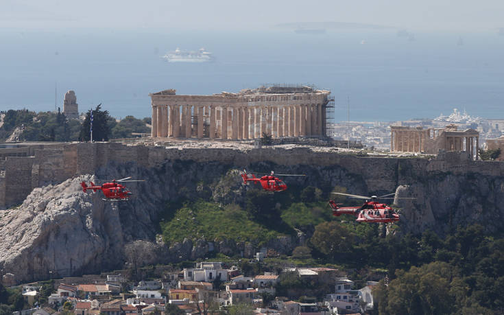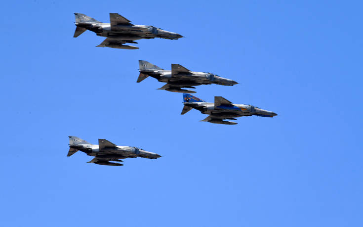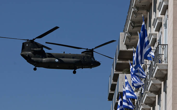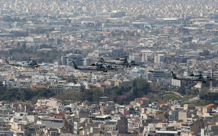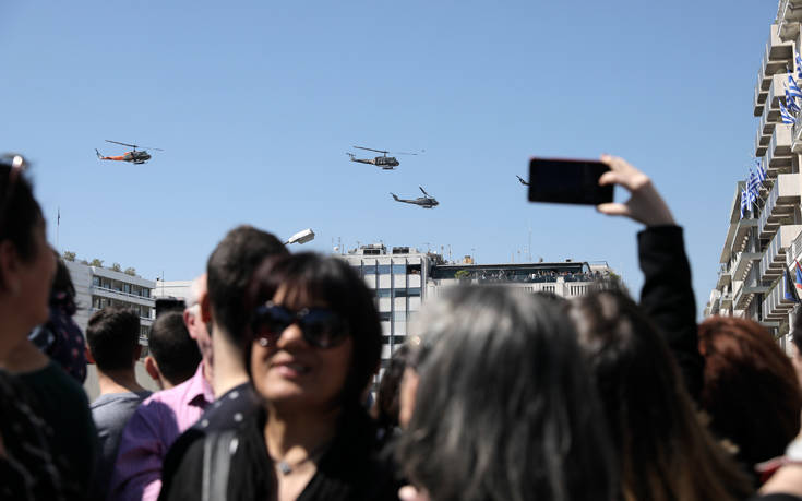 Πάνω από τον χώρο της παρέλασης πέταξαν σε άψογους σχηματισμούς αεροσκάφη F-16 block 52, MIRAGE 2000-5 και F-4 της Πολεμικής Αεροπορίας, ελικόπτερα Απάτσι, Σινούκ ΝΗ-90 της Αεροπορίας Στρατού, ελικόπτερα Σικόρσκι και ΑΒ-212 του Πολεμικού Ναυτικού και ελικόπτερα των σωμάτων ασφαλείας.