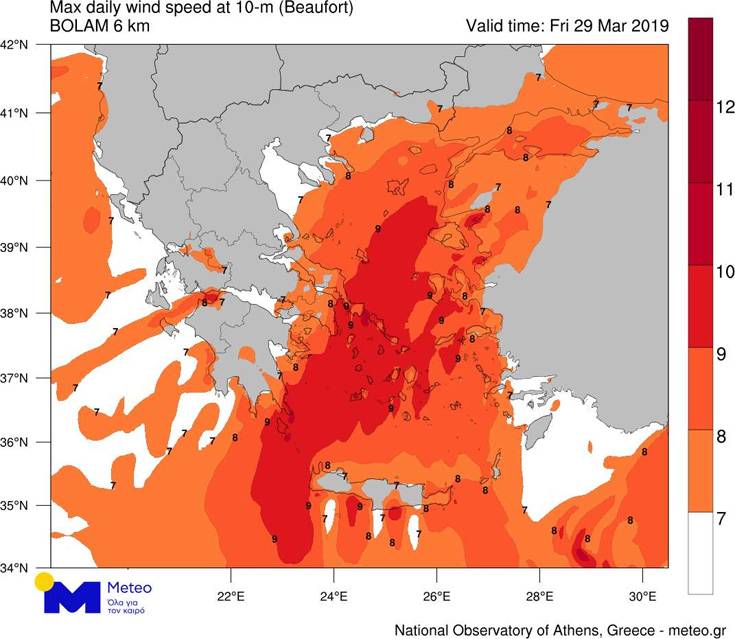 Την Παρασκευή 29/03 ισχυρές βροχές και καταιγίδες (συνοδευόμενες τοπικά από χαλαζοπτώσεις) θα εκδηλωθούν στις Νότιες Κυκλάδες, στην Κρήτη και στα Δωδεκάνησα, με το νησί της Κρήτης να δέχεται μεγάλους όγκους νερού. Πυκνές χιονοπτώσεις αναμένονται στα ορεινά της Κρήτης.