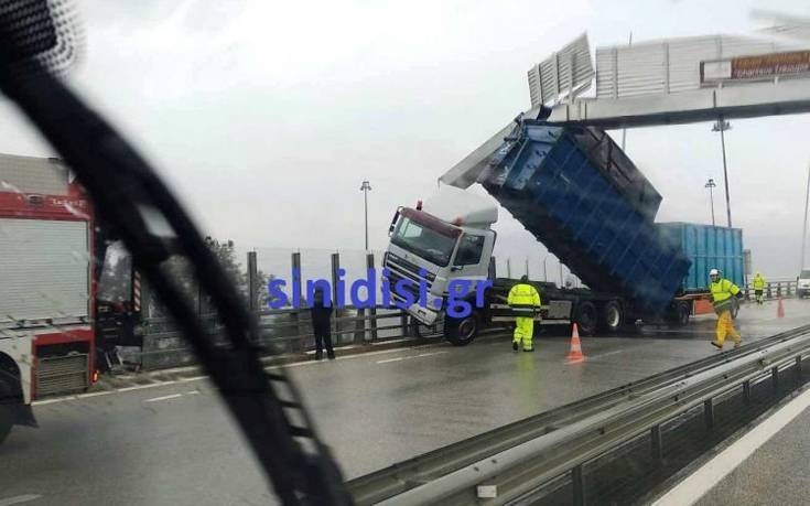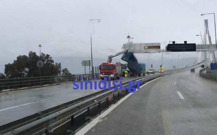 Ατύχημα με μία νταλίκα και την καρότσα της, που κατέληξε πάνω σε πινακίδα στη γέφυρα Ρίου-Αντιρρίου, προκάλεσαν νωρίτερα οι θυελλώδεις άνεμοι που πνέουν στην περιοχή.