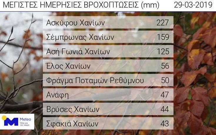 Ήδη από τις πρωινές ώρες της Παρασκευής οι σταθμοί του ΕΑΑ/meteo καταγράφουν πολύ μεγάλα ύψη βροχόπτωσης, ιδιαίτερα στο νομό Χανίων. Στο Ασκύφου Χανίων το πρωί η ημερήσια βροχόπτωση είχε φθάσει τα 227 χιλιοστά, στο Σέμπρωνα Χανίων τα 159 και στην Ασή Γωνιά Χανίων τα 125 χιλιοστά.