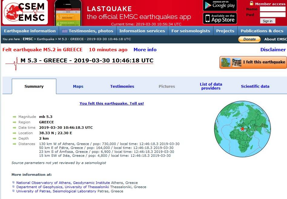 Σύμφωνα με το Ευρωμεσογειακό Ινστιτούτο ο σεισμός ήταν 5,3 Ρίχτερ και είχε εστιακό βάθος 2 χλμ.