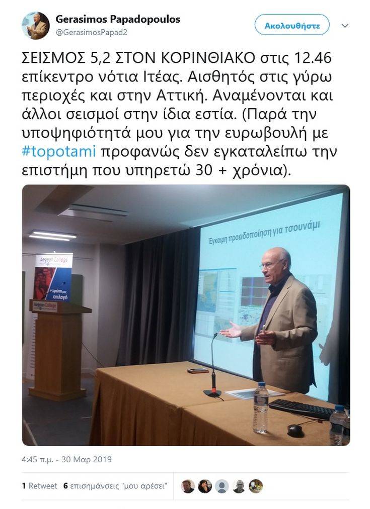 O σεισμολόγος και διευθυντής του Κέντρου Ερευνών του Γεωδυναμικού Ινστιτούτου Αθηνών Γεράσιμος Παπαδόπουλος εκτίμησε στο Twitter ότι «αναμένονται και άλλοι σεισμοί στην ίδια εστία».