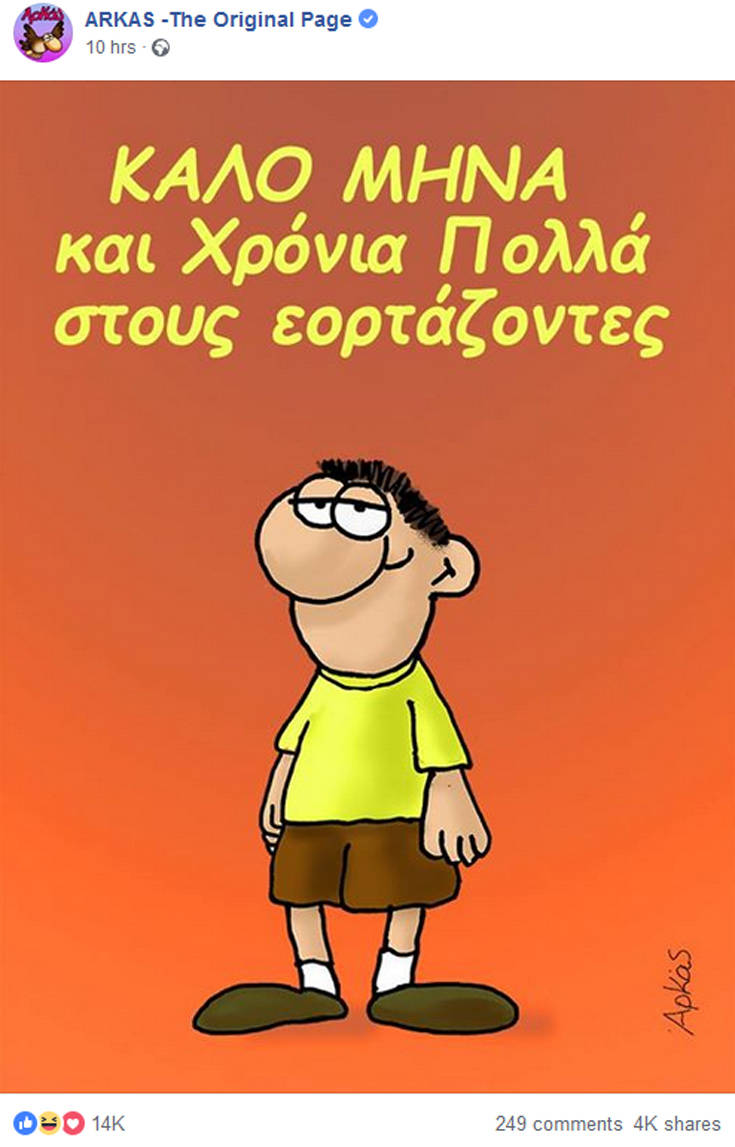 Στο δεύτερο σκίτσο με πρωταγωνιστή τον «μικρό πρωθυπουργό» από τη σειρά με τα σκίτσα για τα παιδικά χρόνια ενός πρωθυπουργού, ο σκιτσογράφος εύχεται «Καλό Μήνα» και «Χρόνια Πολλά στους εορτάζοντες».