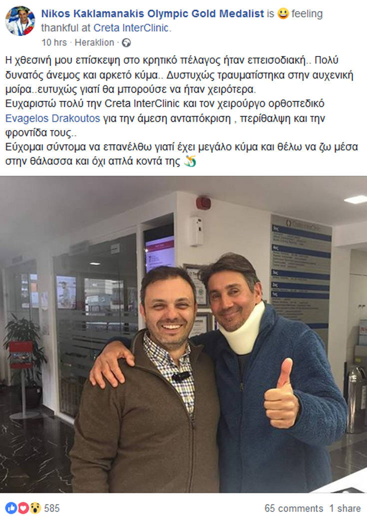 «Η χθεσινή μου επίσκεψη στο κρητικό πέλαγος ήταν επεισοδιακή. Πολύ δυνατός άνεμος και αρκετό κύμα. Δυστυχώς τραυματίστηκα στην αυχενική μοίρα ευτυχώς γιατί θα μπορούσε να ήταν χειρότερα. Ευχαριστώ πολύ την Creta InterClinic και τον χειρούργο ορθοπεδικό Evagelos Drakoutos για την άμεση ανταπόκριση, περίθαλψη και την φροντίδα τους. Εύχομαι σύντομα να επανέλθω γιατί έχει μεγάλο κύμα και θέλω να ζω μέσα στην θάλασσα και όχι απλά κοντά της».