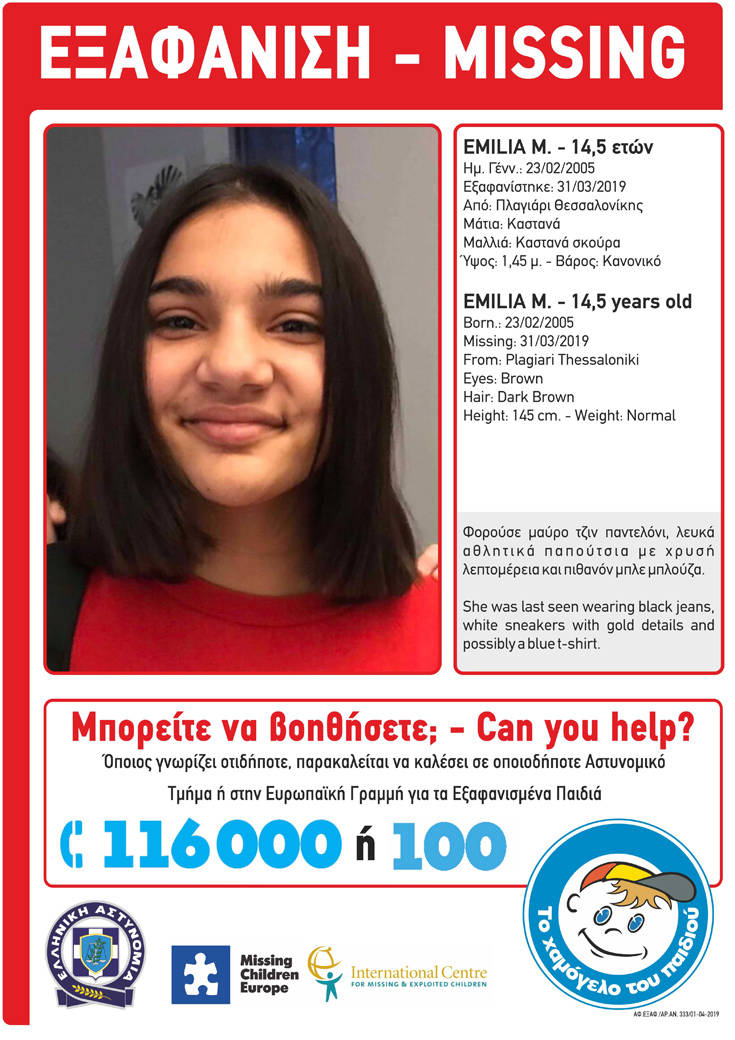 Τα ίχνη της της Emilia Μ, ηλικίας 14,5, ετών χάθηκαν την Κυριακή 31 Μαρτίου στις 13:30 το μεσημέρι από την περιοχή Πλαγιάρι Θεσσαλονίκης.