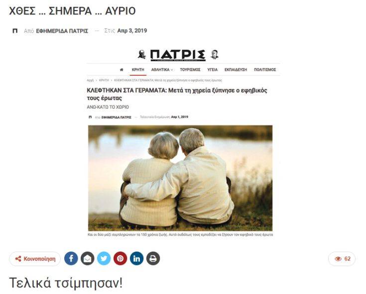 Μια ρομαντική ιστορία από την Κρήτη που δημοσιεύτηκε στην ιστοσελίδα της εφημερίδας «Πατρίς» συγκίνησε πολλούς και έγινε viral στο ελληνικό διαδίκτυο. Επρόκειτο όμως για μια πρωταπριλιάτικη φάρσα και πολλοί «τσίμπησα» στο ψέμα, ανάμεσά τους και εμείς.