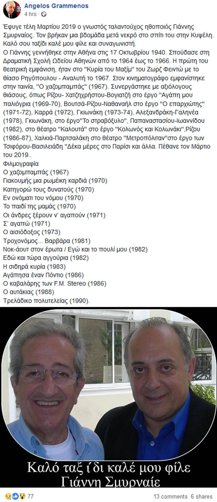«Έφυγε τέλη Μαρτίου 2019 ο γνωστός ταλαντούχος ηθοποιός Γιάννης Σμυρναίος. Τον βρήκαν μια βδομάδα μετά νεκρό στο σπίτι του στην Κυψέλη. Καλό σου ταξίδι καλέ μου φίλε και συναγωνιστή.