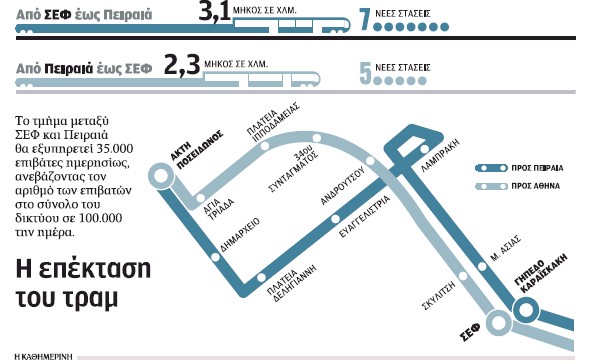 Χθες υπεγράφη μεταξύ του προέδρου της Αττικό Μετρό Χρ. Τσίτουρα και του εκπροσώπου της αναδόχου εταιρείας ΘΕΜΕΛΗ Α.Ε. Δημ. Ντινόπουλου η σύμβαση κατασκευής της επέκτασης του τραμ στον Πειραιά, ύψους 61,5 εκατ. ευρώ.