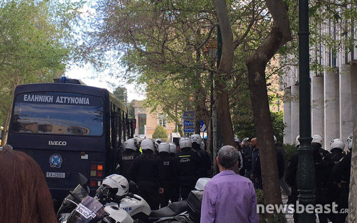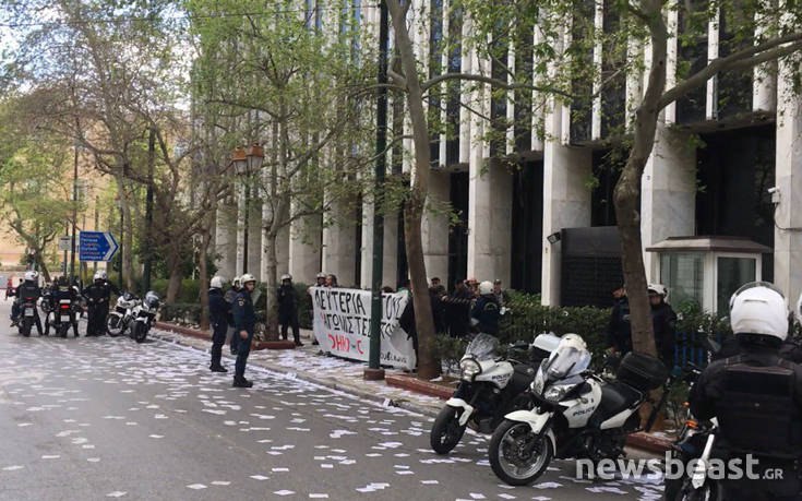 Μία ομάδα που αποτελείτο από 10 με 15 άτομα προσέγγισε το υπουργείο Εξωτερικών στο κέντρο της Αθήνας, πετώντας τρικάκια ενώ προσπάθησαν να ανοίξουν ένα πανό.