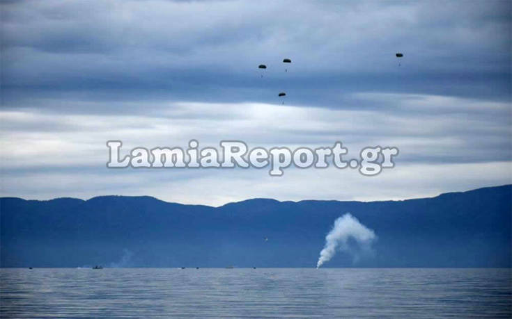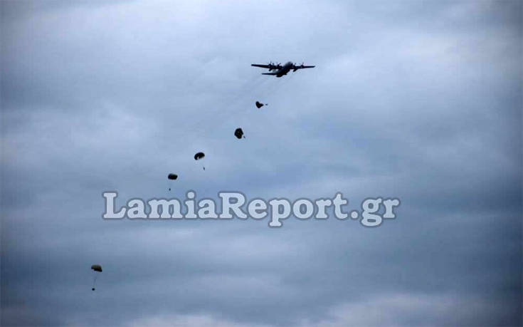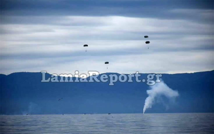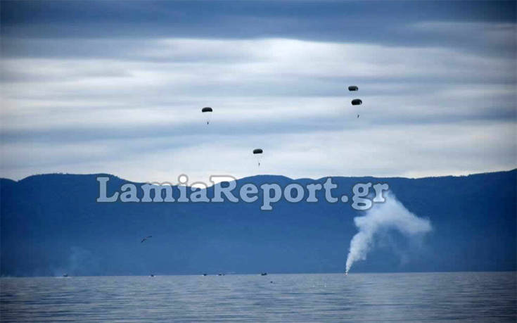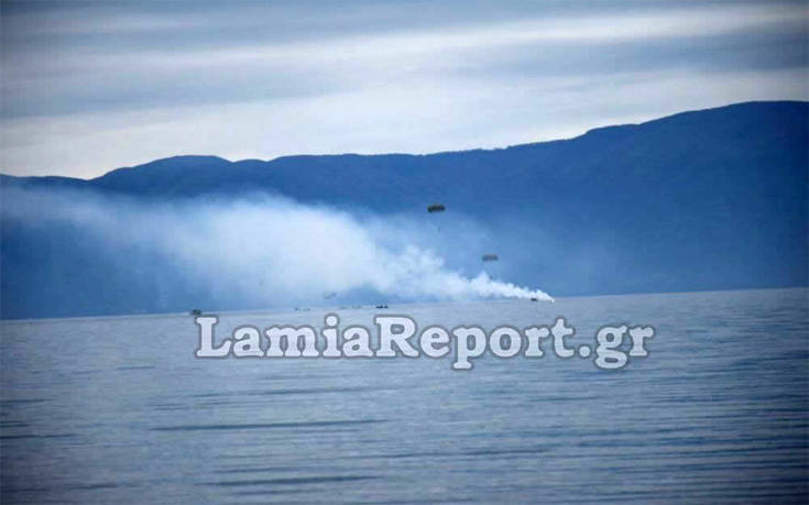 Δεν πίστευαν στα μάτια τους το πρωί οι λιγοστοί κάτοικοι στη γνωστή παραλία της Αταλάντης, όταν είδαν τον ουρανό να γεμίζει από αλεξιπτωτιστές οι οποίοι έκαναν πτώση στη θάλασσα από ένα C130.