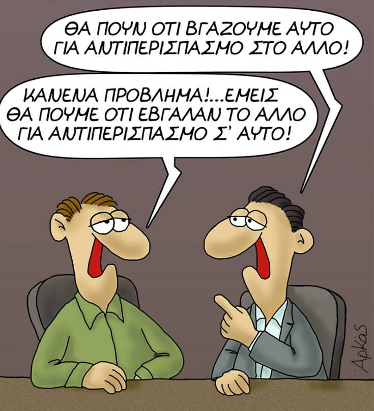 Το σκίτσο παραπέμπει σε δύο στελέχη της κυβέρνησης που οργανώνουν την επικοινωνιακή… απάντηση της κυβέρνησης.
