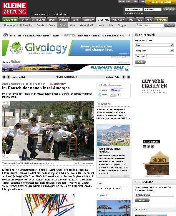 Όπως τονίζεται στο δημοσίευμα της «Κλάινε Τσάιτουνγκ» με τίτλο «Στον πυρετό του νέου νησιού», την Αμοργό είχαν «ανακαλύψει» οι Γάλλοι τουρίστες μετά την ταινία του Λουκ Μπεσόν, «Απέραντο γαλάζιο», το 1988 και τώρα το «Σπρίνγκερ Ράιζεν» προσπαθεί να φέρει πιο κοντά και στους Αυστριακούς τουρίστες το νησί που, σύμφωνα με την κ. Σπρίνγκερ, είναι ένα ιδιαίτερο ελληνικό νησί που δεν μπορεί να συγκριθεί με κανένα άλλο, «ένας μυστικιστικός τόπος, γεμάτος ενέργεια και δύναμη».