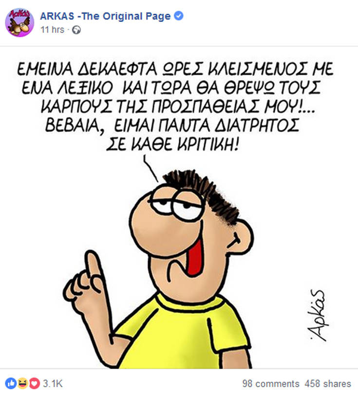 «Έμεινα δεκαεφτά ώρες κλεισμένος με ένα λεξικό και τώρα θα θρέψω τους καρπούς της προσπάθειάς μου!… Βέβαια, είμαι πάντα διάτρητος σε κάθε κριτική!», αναφέρεται στο ένα σκίτσο του Αρκά.