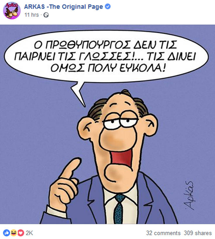 Ένα δεύτερο, πάλι με θέμα τον πρωθυπουργό, σημειώνει: «Ο πρωθυπουργός δεν τις παίρνει τις γλώσσες!… Τις δίνει όμως πολύ εύκολα!».