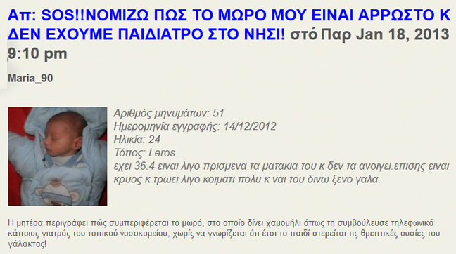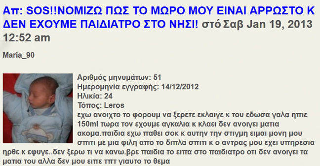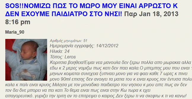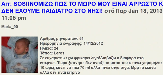 Στην απελπισία της επάνω στράφηκε στο Ίντερνετ. Έτσι, μπήκε σε ένα φόρουμ νέων μητέρων, και προσπαθούσε να σώσει το παιδί της, λέγοντας τα παρακάτω συγκλονιστικά: