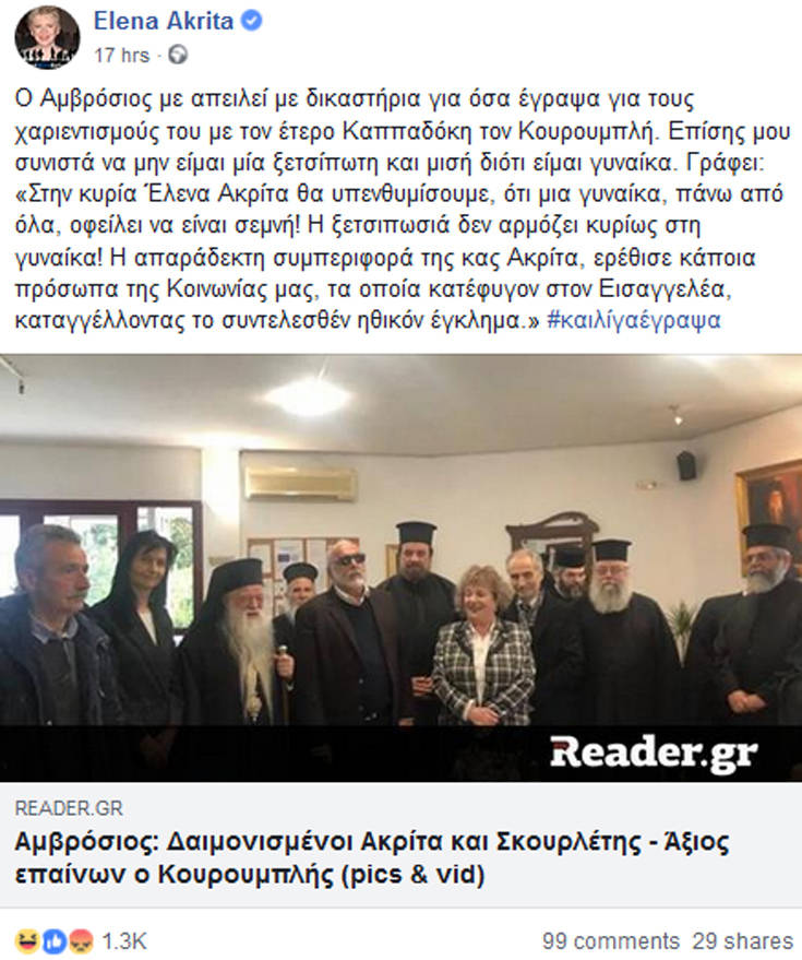 Γράφει η Έλενα Ακρίτα: «Ο Αμβρόσιος με απειλεί με δικαστήρια για όσα έγραψα για τους χαριεντισμούς του με τον έτερο Καππαδόκη τον Κουρουμπλή. Επίσης μου συνιστά να μην είμαι μία ξετσίπωτη και μισή, διότι είμαι γυναίκα. Γράφει: «Στην κυρία Έλενα Ακρίτα θα υπενθυμίσουμε, ότι μια γυναίκα, πάνω από όλα, οφείλει να είναι σεμνή! Η ξετσιπωσιά δεν αρμόζει κυρίως στη γυναίκα! Η απαράδεκτη συμπεριφορά της κας Ακρίτα, ερέθισε κάποια πρόσωπα της Κοινωνίας μας, τα οποία κατέφυγον στον Εισαγγελέα, καταγγέλλοντας το συντελεσθέν ηθικόν έγκλημα».