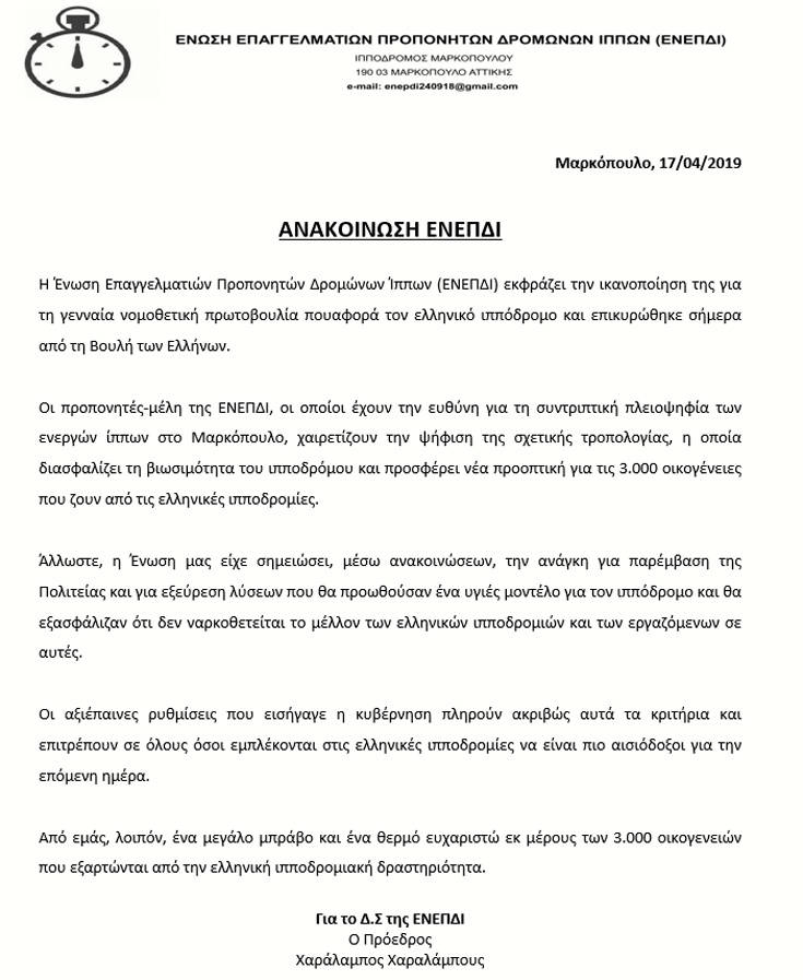 Άλλωστε, η ΕΝΠΔΙ μέσω ανακοινώσεων είχε τονίσει την ανάγκη για παρέμβαση της Πολιτείας και για εξεύρεση λύσεων, που θα προωθούσαν ένα υγιές μοντέλο για τον ιππόδρομο και θα εξασφάλιζαν ότι δεν ναρκοθετείται το μέλλον των ελληνικών ιπποδρομιών και των εργαζόμενων σε αυτές.