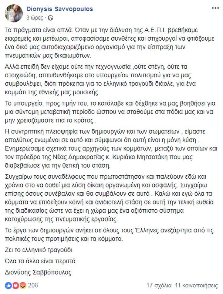 Σε ανάρτησή του στο Facebook, ο Διονύσης Σαββόπουλος τονίζει:
