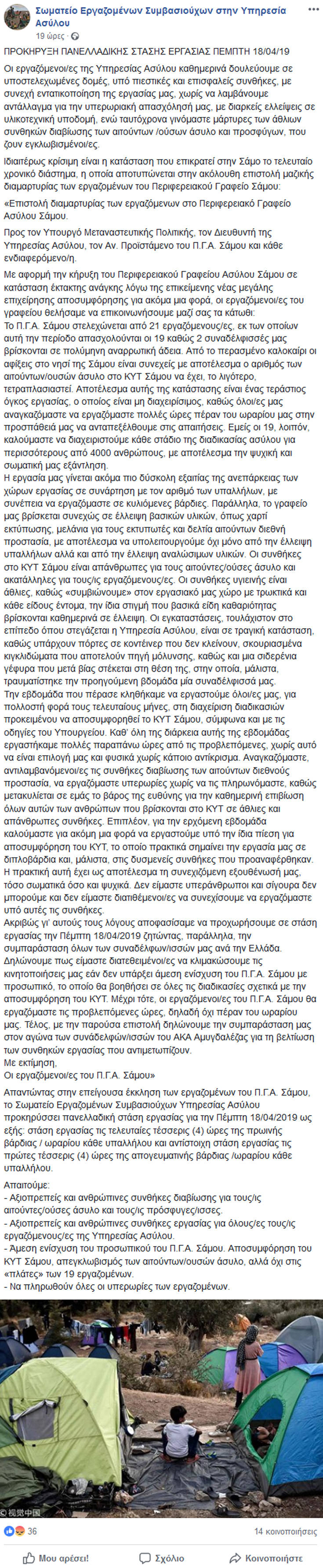 «Οι εργαζόμενοι/ες της Υπηρεσίας Ασύλου καθημερινά δουλεύουμε σε υποστελεχωμένες δομές, υπό πιεστικές και επισφαλείς συνθήκες, με συνεχή εντατικοποίηση της εργασίας μας, χωρίς να λαμβάνουμε αντάλλαγμα για την υπερωριακή απασχόλησή μας, με διαρκείς ελλείψεις σε υλικοτεχνική υποδομή, ενώ ταυτόχρονα γινόμαστε μάρτυρες των άθλιων συνθηκών διαβίωσης των αιτούντων/ούσων άσυλο και προσφύγων, που ζουν εγκλωβισμένοι/ες»