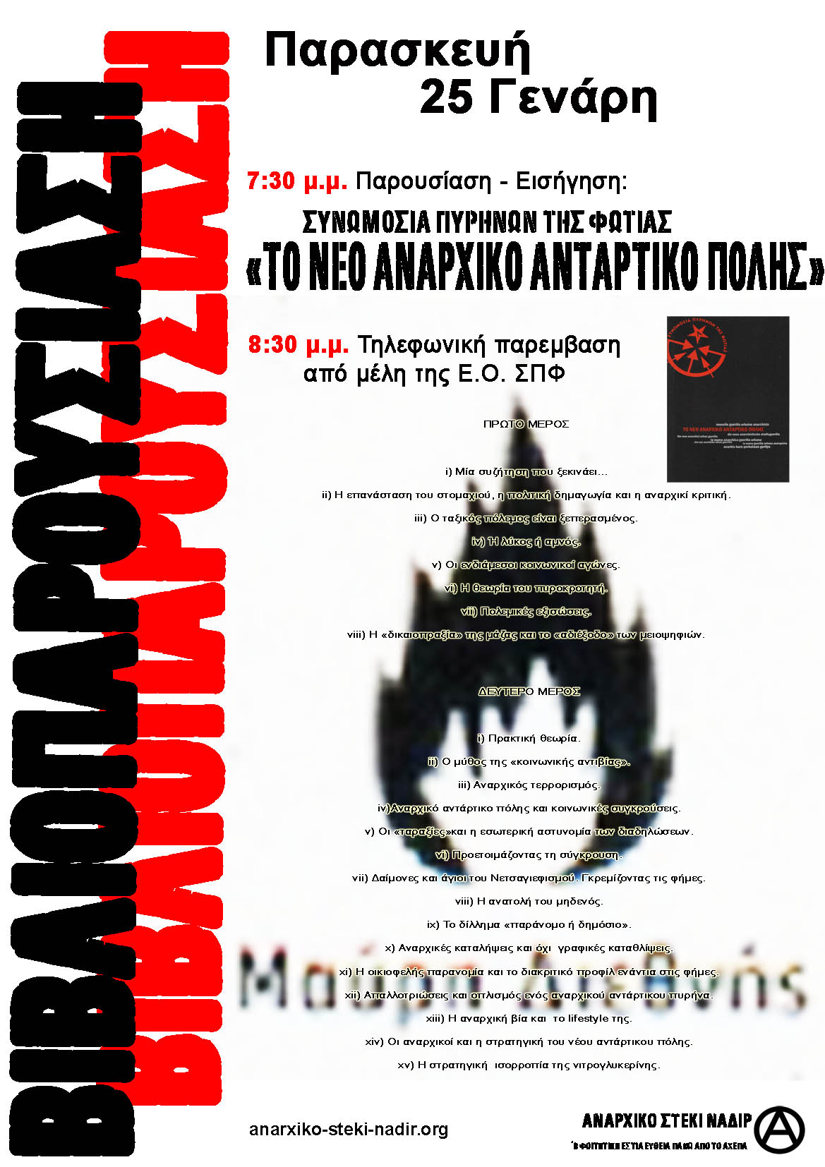 Το βιβλίο με τίτλο «Το νέο αναρχικό αντάρτικο πόλης» θα παρουσιαστεί σε εκδήλωση που θα γίνει στις 7:30 το απόγευμα της Παρασκευής στο αναρχικό στέκι «Ναδίρ« που βρίσκεται στη Β’ φοιτητική εστία της Θεσσαλονίκης.
