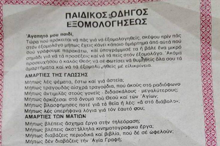 Αμαρτίες «της γλώσσας, των ματιών, των χεριών, των ποδιών, των αυτιών» και «διάφορα άλλα αμαρτήματα» περιλαμβάνει ο «παιδικός οδηγός εξομολόγησης» που δόθηκε σε μαθητές και μαθήτριες της Λέσβου έπειτα από εκκλησιασμό, όπως δημοσιεύει το stonisi.gr.