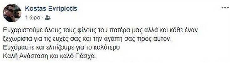 «Ευχαριστούμε όλους τους φίλους του πατέρα μας, αλλά και κάθε έναν ξεχωριστά για τις ευχές σας και την αγάπη σας προς αυτόν. Ευχόμαστε και ελπίζουμε για το καλύτερο. Καλή Ανάσταση και καλό Πάσχα».