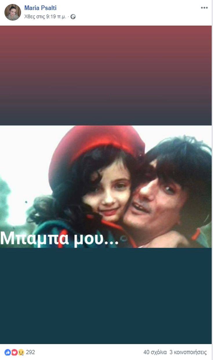 Με αφορμή τη συμπλήρωση δύο ετών από τον θάνατο του αγαπημένου ηθοποιού, η κόρη του, Μαρία Ψάλτη, ανέβασε στο Facebook μία παιδική της φωτογραφία στην αγκαλιά του πατέρα της, με τη λεζάντα: «μπαμπά μου…».