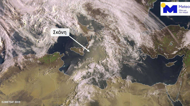 Στην παρακάτω εικόνα βλέπετε τη μεγάλη συγκέντρωση σκόνηςστην Κεντρική Μεσόγειο που κινείται προς τη χώρα μας το πρωί της Μ. Τρίτης 23 Απριλίου 2019. Η δορυφορική λήψη και επεξεργασία της εικόνας από το Εθνικό Αστεροσκοπείο Αθηνών/meteo.gr έγινε στις 09:30.