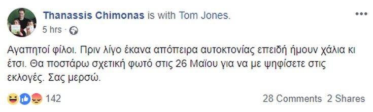Ο υποψήφιος ευρωβουλευτής με το Ποτάμι έγραψε συγκεκριμένα: «Αγαπητοί φίλοι, πριν λίγο έκανα απόπειρα αυτοκτονίας επειδή ήμουν χάλια κι έτσι. Θα ποστάρω σχετική φωτό στις 26 Μαΐου για να με ψηφίσετε στις εκλογές. Σας μερσώ».