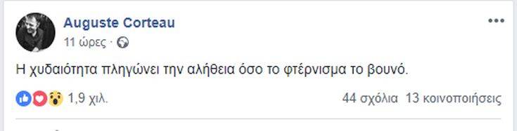 «Η χυδαιότητα πληγώνει την αλήθεια όσο το φτέρνισμα το βουνό» έγραψε το βράδυ της Μεγάλης Τετάρτης ο Αύγουστος Κορτώ, μετά και τη δεύτερη ανάρτηση του Θανάση Χειμωνά με την οποία επιχείρησε να δώσει εξηγήσεις για το πρώτο σχόλιό του.