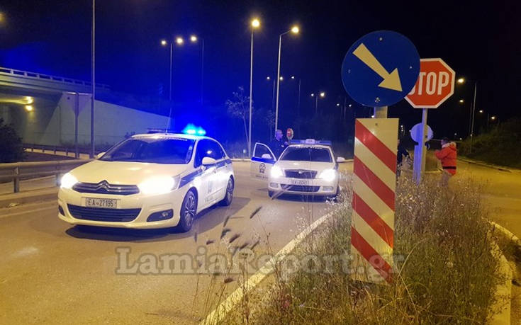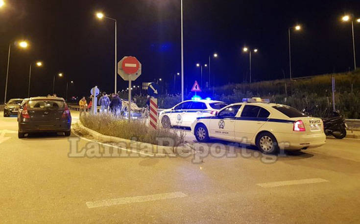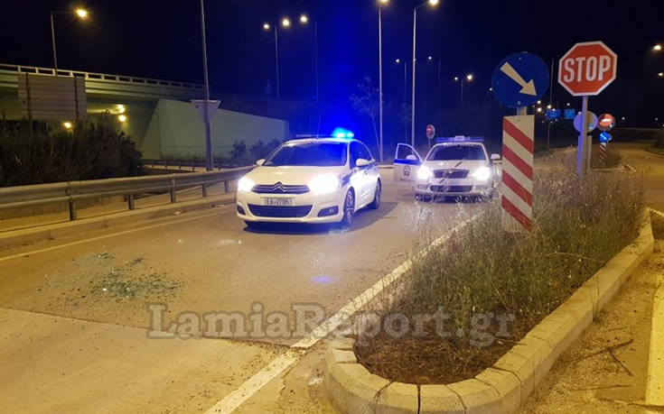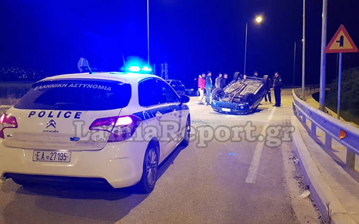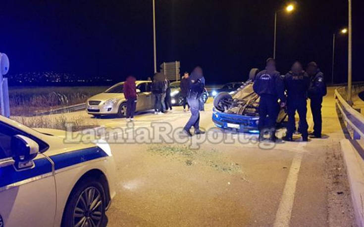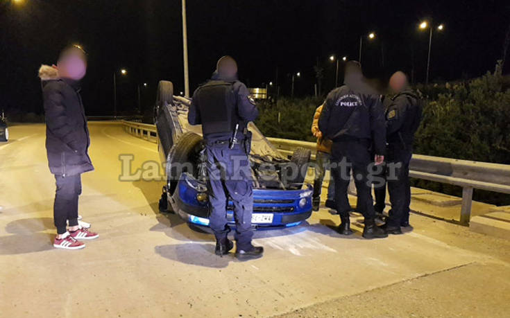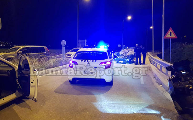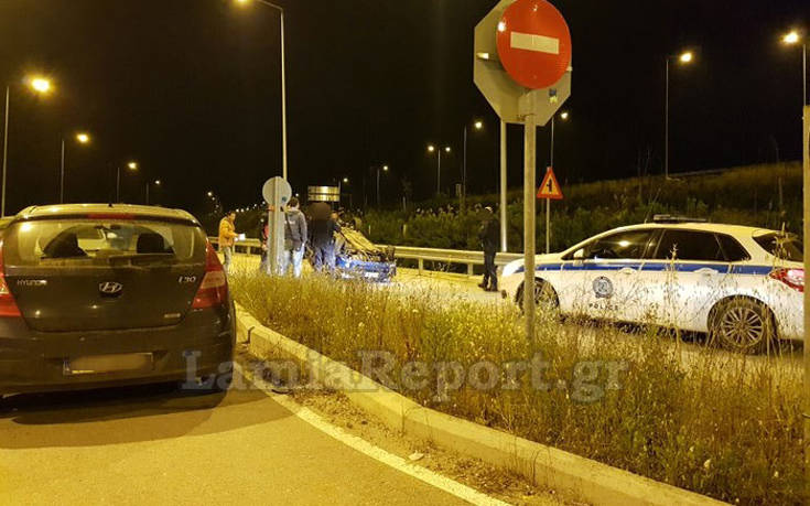 Με τον ουρανό ανάποδα βρέθηκε ένα μπλε αυτοκίνητο στον παράδρομο της εισόδου της πόλης της Λαμίας, λίγο μετά τις 11 το βράδυ της Μεγάλης Τετάρτης (24/04).