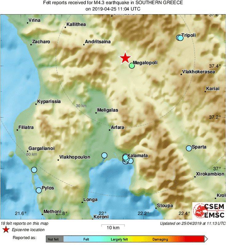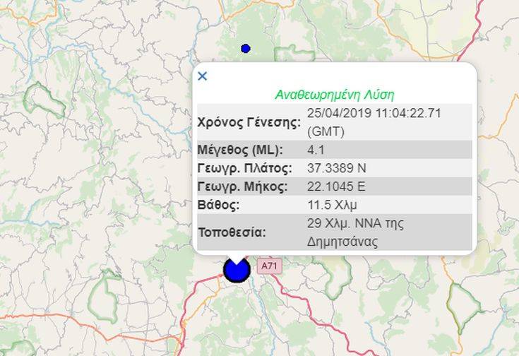Σεισμική δόνηση σημειώθηκε πριν από λίγα λεπτά με επίκεντρο 29 χιλιόμετρα νότιο-νοτιοανατολικά της Δημητσάνας και εστιακό βάθος τα 11,5 χιλιόμετρα.