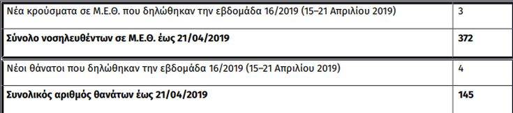 Συνολικά έχουν καταγραφεί 145 θάνατοι από εργαστηριακά επιβεβαιωμένη γρίπη. Οι 131 θάνατοι αφορούσαν σε ασθενείς που νοσηλεύτηκαν σε Μ.Ε.Θ και 14 σε ασθενείς χωρίς νοσηλεία σε Μ.Ε.Θ.
