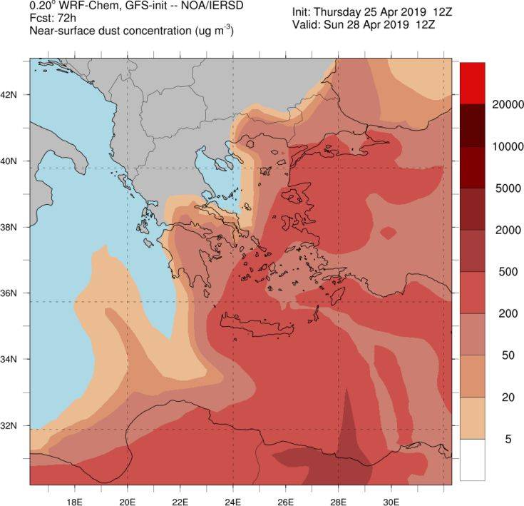 Σημειώνεται όμως ότι παρ’ ότι στο μεγαλύτερο μέρος της χώρας οι συγκεντρώσεις σκόνης θα μειωθούν σημαντικά έως την Κυριακή του Πάσχα 28/04, στο Ανατολικό και Νότιο Αιγαίο θα παραμείνουν αυξημένες.