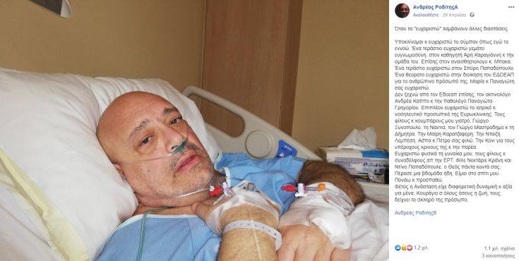 Δεν ξεχνώ από τον ΕΔΟΕΑΠ επίσης, τον ακτινολόγο Ανδρέα Καππο κ την παθολόγο Παναγιώτα Γρηγορίου. Επιπλέον ευχαριστώ το ιατρικό κ νοσηλευτικό προσωπικό της Ευρωκλινικής. Τους φίλους κ κουμπάρους μου γιατρό, Γιώργο Ξυνόπουλο, τη Νάντια, τον Γιώργο Μαστροδήμο κ τη Δήμητρα. Την Μαίρη Καρατζαφέρη. Την Νταίζη Λεμπέση. Άσπα κ Πέτρο σας φιλώ. Την Κόνι για τους υπέροχους κρίνους της και την παρέα» έγραψε ο Ανδρέας Ροδίτης.