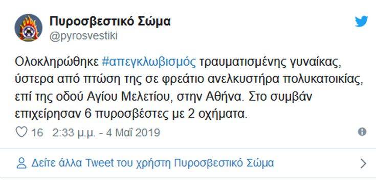 «Ολοκληρώθηκε απεγκλωβισμός τραυματισμένης γυναίκας, ύστερα από πτώση της σε φρεάτιο ανελκυστήρα πολυκατοικίας, επί της οδού Αγίου Μελετίου, στην Αθήνα. Στο συμβάν επιχείρησαν 6 πυροσβέστες με 2 οχήματα».