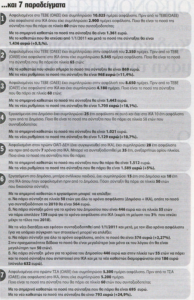 2. Το ΙΚΑ και τα άλλα Ταμεία μισθωτών δίνουν σύνταξη στο 58ο έτος (σημ. και το 2011 έστω με 36 έτη ασφάλισης) αλλά ο ΟΑΕΕ, στις περιπτώσεις που υπήρχε ασφάλιση στο ΤΕΒΕ ή το ΤΣΑ των αυτοκινητιστών, απαιτεί τη συμπλήρωση του 60ού έτους ως ελάχιστη προϋπόθεση. Εως τώρα, στις περιπτώσεις που κάποιος συνταξιούχος ήθελε να πάρει και τη συμμετοχή του ΟΑΕΕ στο 58ο έτος, το πέναλτι ήταν μόλις 3% για κάθε χρόνο. Με τον νέο νόμο για τη διαδοχική ασφάλιση το πέναλτι γίνεται 6% και συνολικά μείον 12% στην περίπτωσή μας. Εναλλακτικά, εάν ο ασφαλισμένος λάβει τη συμμετοχή του ΟΑΕΕ δύο χρόνια μετά (στο 60ό έτος) δεν θα έχει καμιά επίπτωση στο ποσό της σύνταξης που αναλογεί στο προηγούμενο Ταμείο (ΟΑΕΕ). Το ίδιο «χαμένες» είναι και οι μητέρες που βγαίνουν στη σύνταξη στα 55ο (ΙΚΑ) αλλά ο ΟΑΕΕ περικόπτει τη συμμετοχή του.