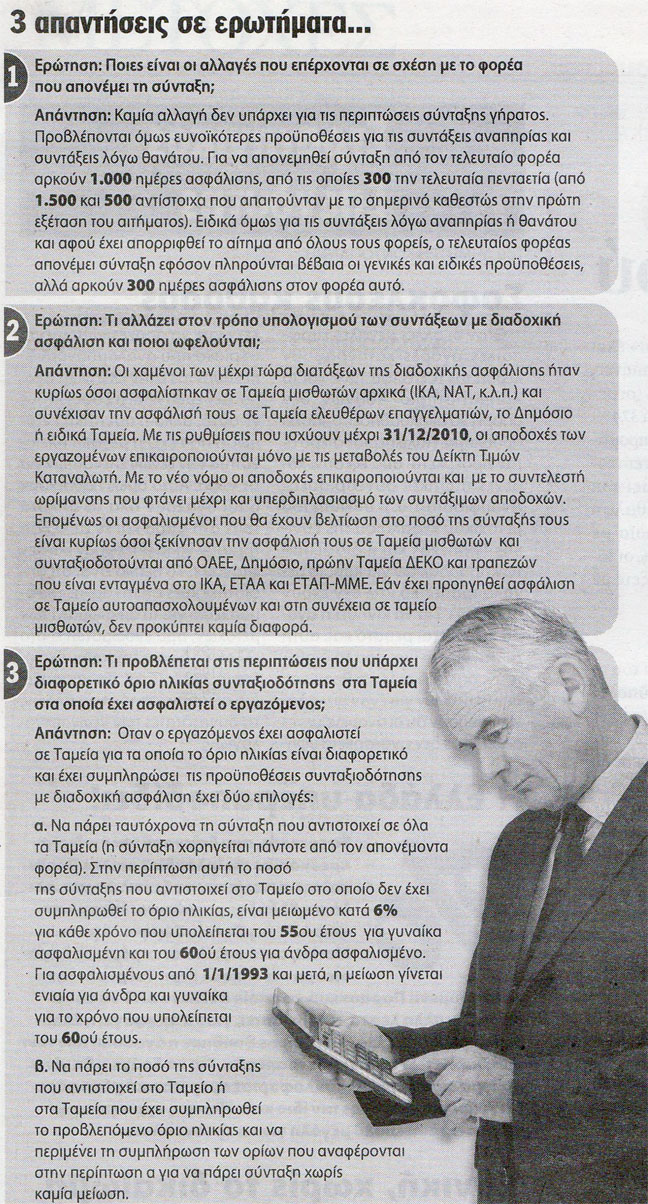 Με βάση τις ρυθμίσεις του νόμου, στις περιπτώσεις διαδοχικής ασφάλισης οι συντάξιμες αποδοχές του παρελθόντος (προηγούμενο ή προηγούμενα Ταμεία), εκτός από τον Δείκτη Τιμών Καταναλωτή, αναπροσαρμόζονται και με ένα συντελεστή βελτίωσης. Κατ’ αυτόν τον τρόπο οι συντάξιμες αποδοχές διπλασιάζονται ύστερα από 35 έτη. Σύμφωνα με εγκύκλιο του υπουργού αναπληρωτή Εργασίας Γ. Κουτρουμάνη, οι πιο κερδισμένοι είναι όσοι είχαν ασφαλιστέο χρόνο στο ΙΚΑ και ακολούθως προσελήφθησαν στο Δημόσιο (χωρίς αναγνώριση χρόνου), σε τράπεζα ή δημόσια υπηρεσία ή, το πιο συνηθισμένο, άνοιξαν δική τους δουλειά και ασφαλίστηκαν στη συνέχεια στον ΟΑΕΕ.