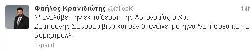 Συγκεκριμένα ο κ. Κρανιδιώτης έγραψε: «Ν’ αναλάβει την εκπαίδευση της αστυνομίας ο Χρ. Ζαμπούνης. Σαβουάρ βιβρ και δεν θ’ ανοίγει μύτη, να ‘ναι ήσυχα τα συριζοτρολλ».