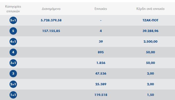 Οι τυχεροί αριθμοί είναι: 3, 14, 15, 17, 45 Τζόκερ ο αριθμός: 1