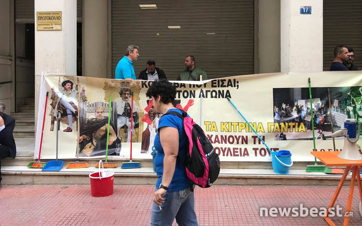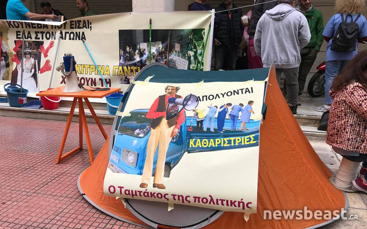 Οι καθαρίστριες έστησαν σκηνές έξω από το υπουργείο και δηλώνουν ότι δεν αποχωρούν, εάν δεν δοθεί λύση στο ζήτημά τους.