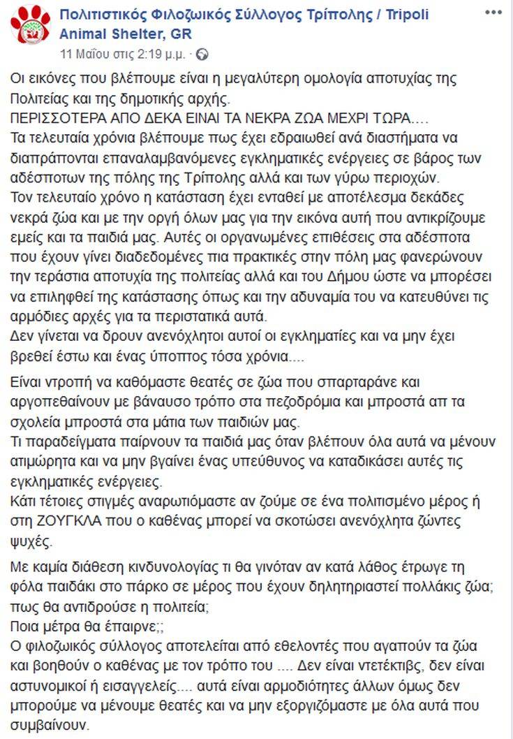«Τα τελευταία χρόνια βλέπουμε πως έχει εδραιωθεί ανά διαστήματα να διαπράττονται επαναλαμβανόμενες εγκληματικές ενέργειες σε βάρος των αδέσποτων της πόλης της Τρίπολης αλλά και των γύρω περιοχών», αναφέρει η οργάνωση και δημοσιεύει σκληρές εικόνες.