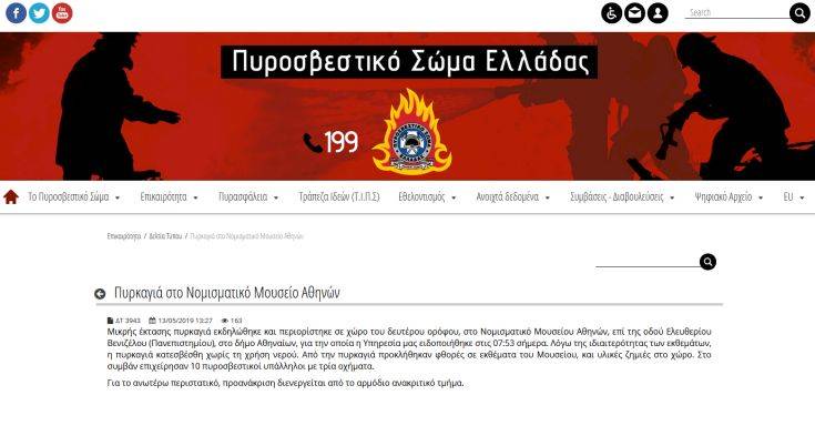 Μικρής έκτασης πυρκαγιά εκδηλώθηκε και περιορίστηκε σε χώρο του δευτέρου ορόφου, στο Νομισματικό Μουσείου Αθηνών, επί της Πανεπιστημίου, στο δήμο Αθηναίων, για την οποία η Υπηρεσία μας ειδοποιήθηκε στις 07:53 σήμερα.