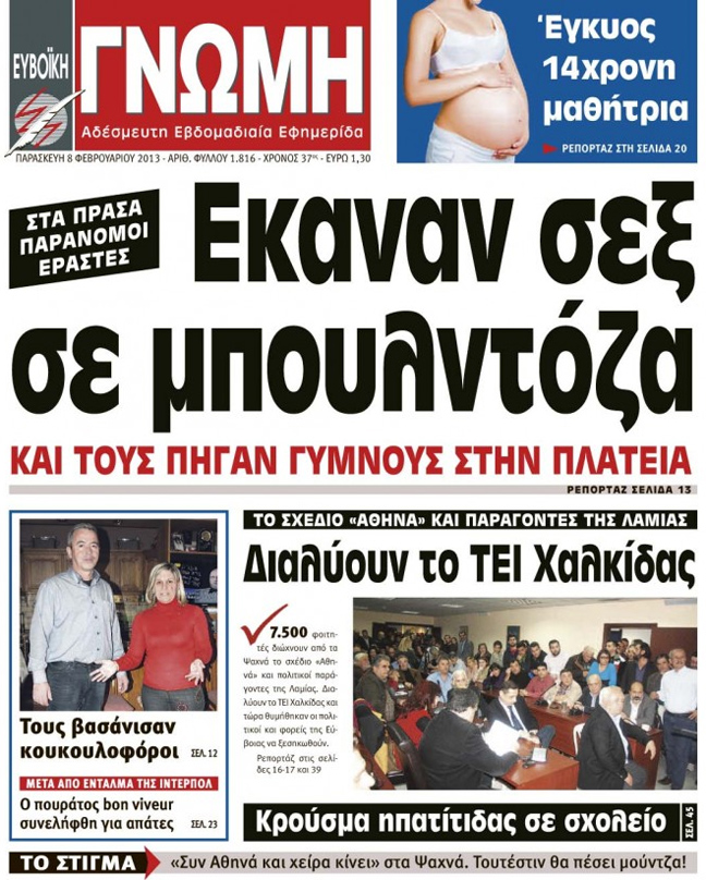 «Έκαναν σεξ σε μπουλντόζα και τους πήγαν γυμνούς στην πλατεία», γράφει ο πηχυαίος τίτλος της εφημερίδας «Ευβοϊκή Γνώμη», που κυκλοφόρησε πριν από λίγες ημέρες.