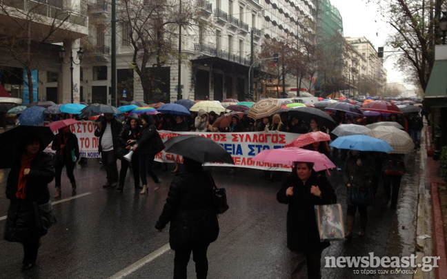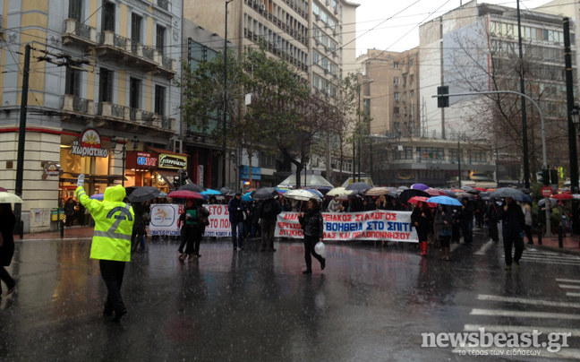 Αυτή την ώρα οι εργαζόμενοι, παρά τη δυνατή βροχή, κατευθύνονται προς το υπουργείο Εργασίας.