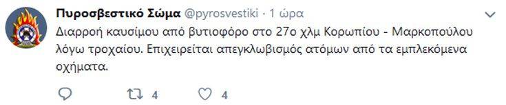 «Διαρροή καυσίμου από βυτιοφόρο στο 27ο χλμ Κορωπίου – Μαρκοπούλου λόγω τροχαίου. Επιχειρείται απεγκλωβισμός ατόμων από τα εμπλεκόμενα οχήματα», ανέφερε σε μήνυμά της στο Twitter η Πυροσβεστική.